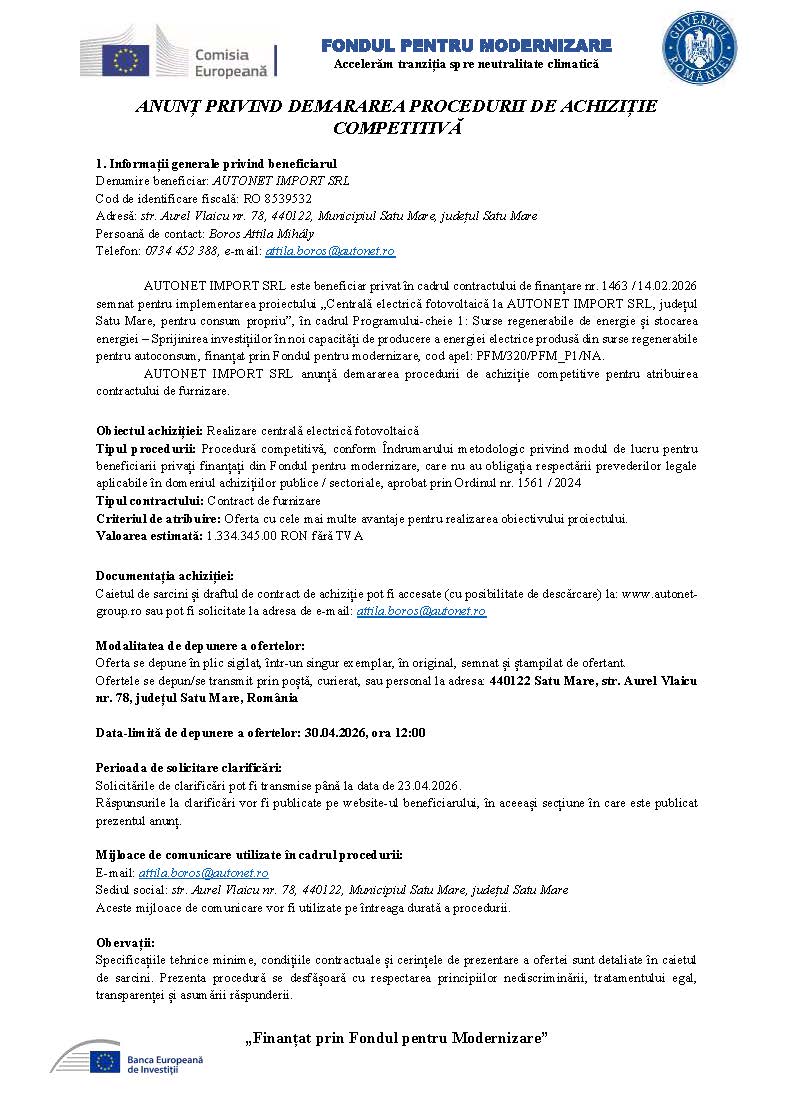 Anunț privind demararea procedurii de achiziție competitivă